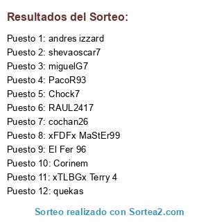 Lista de participantes: andres izzard, El Fer 96, cochan26, RAUL2417, xFDFx MaStEr99, Corinem, miguelG7, Chock7, shevaoscar7, quekas, xTLBGx Terry 4, PacoR93.