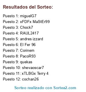 Lista de participantes: andres izzard, El Fer 96, cochan26, RAUL2417, xFDFx MaStEr99, Corinem, miguelG7, Chock7, shevaoscar7, quekas, xTLBGx Terry 4, PacoR93.