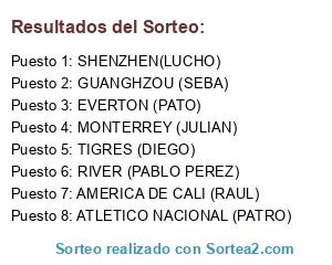 Lista de participantes: TIGRES (DIEGO), SHENZHEN(LUCHO), ATLETICO NACIONAL (PATRO), EVERTON (PATO), MONTERREY (JULIAN), RIVER (PABLO PEREZ), AMERICA DE CALI (RAUL), GUANGHZOU (SEBA).