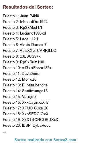 Lista de participantes: XxxCayinxxX l7l, xJESUS97x, El pata bendita, Lc X Emmanuel 2, x13x xForza182x, RpSxTeran l3l, Luciano1993xd, SensoryErmine72, InboardOrc1924, lBSPl DybaRooL, Brayaneto18, Morro26, Vallejo x, XxoSERGIOxX, Lage i 12 i, Juan P4bl0, Santichango13, Duva0one, Danilinho999, XFUO Cuca 26, RpSxEze l1l, Kopersv100, XxXTRONCOBUXxX, x iTz Blazee x, ALEXXIZ-CARRILLO, RpSxRuiz l10l, saul240617, Alexis Ramos 7, Amsolis923, Robert0 Lerma, RpSxAbel l7l, Hugo King 007.