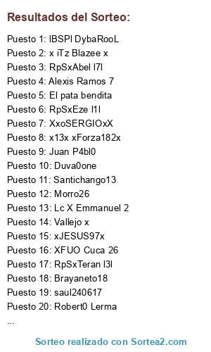 Lista de participantes: XxxCayinxxX l7l, xJESUS97x, El pata bendita, Lc X Emmanuel 2, x13x xForza182x, RpSxTeran l3l, Luciano1993xd, SensoryErmine72, InboardOrc1924, lBSPl DybaRooL, Brayaneto18, Morro26, Vallejo x, XxoSERGIOxX, Lage i 12 i, Juan P4bl0, Santichango13, Duva0one, Danilinho999, XFUO Cuca 26, RpSxEze l1l, Kopersv100, XxXTRONCOBUXxX, x iTz Blazee x, ALEXXIZ-CARRILLO, RpSxRuiz l10l, saul240617, Alexis Ramos 7, Amsolis923, Robert0 Lerma, RpSxAbel l7l, Hugo King 007.