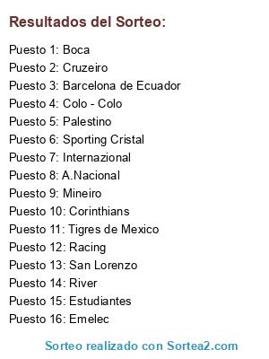 Lista de participantes: Mineiro, Colo - Colo, San Lorenzo, Corinthians, Cruzeiro, Estudiantes, Emelec, Internazional, Boca, Palestino, River, Tigres de Mexico, A.Nacional, Barcelona de Ecuador, Racing, Sporting Cristal.