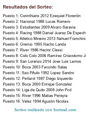 Lista de participantes: River 1996 Matias Pereyra, Atletico Mineiro 2013 Nahuel Franchini, Boca 2000 Enrique Gonzalez, Peñarol 1987 Diego Izquierdo, Estudiantes 2009 Alvaro Saravia, San Lorenzo 2014 Jose Luis Lamos, Nacional 1988 Lucas Romero, Sao PAulo 1992 Lopez Sandro, River 1986 Hector Clessi, Boca 2003 Facundo Salas, Gremio 1995 Nacho Landa, Racing 1988 Daniel Juarez De Espeche, Corinthians 2012 Ezequiel Florentin, Liga de Quito 2008 John Pcd, Colo Colo 2006 Ramírez Crisostomo Jonathan, Velez 1994 Agustin Nicolas.