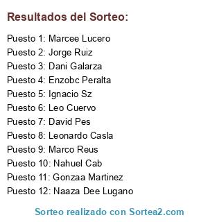 Lista de participantes: Leo Cuervo, Leonardo Casla, Enzobc Peralta, Ignacio Sz, Jorge Ruiz, Marcee Lucero, Nahuel Cab, Gonzaa Martinez, Marco Reus, Dani Galarza.