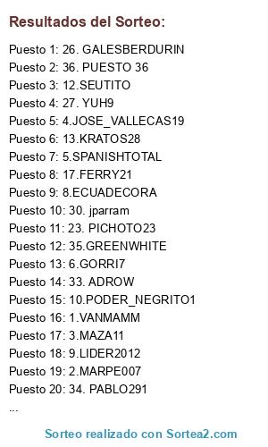 Lista de participantes: 1.VANMAMM, 2.MARPE007, 3.MAZA11, 4.JOSE_VALLECAS19, 5.SPANISHTOTAL, 6.GORRI7, 7.BOGARDE9, 8.ECUADECORA, 9.LIDER2012, 10.PODER_NEGRITO1, 11.ANDRESROCK, 12.SEUTITO, 13.KRATOS28, 14.LAGONDARK, 15.CLAVIJO, 16.IVANX7, 17.FERRY21, 18. XERNOVIL, 19. TRACKBIL, 20. VICTOR_MOONO, 21. NARUTO082006, 22. M-R-L-S, 23. PICHOTO23, 24. MARIO13ARES, 25. DELVAL_11, 26. GALESBERDURIN, 27. YUH9, 28. BILLY1, 29. Txito-21, 30. jparram, 31. ivancit00_86, 32. huied, 33. ADROW, 34. PABLO291, 35.GREENWHITE, 36. PUESTO 36.
