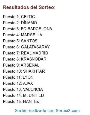 Lista de participantes: KRASNODAR, VALENCIA, NANTEs, AJAX, FC BARCELONA, MARSELLA, CELTIC, SHAKHTAR, REAL MADRID, ARSENAL, SANTOS, GALATASARAY, DÍNAMO, M. UNITED, LYON.