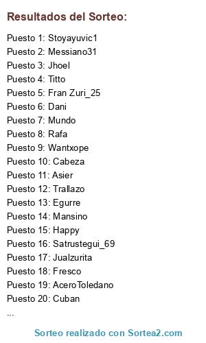 Lista de participantes: Wantxope, Dani, Iban, Cuban, Martin, Jualzurita, Titto, Rafa, Trallazo, AceroToledano, Mansino, Jhoel, Papiyorchu, Happy, Julicadiz, Cabeza, Stoyayuvic1, Satrustegui_69, Younes, Eltirillas66, Mureator, Jordi25, Fresco, Egurre, Nyzanes, Javiixu14, Messiano31, Mundo, Asier, Fran Zuri_25.