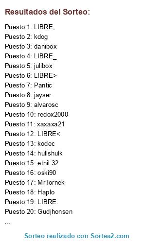 Lista de participantes: alvarosc, MrTornek, redox2000, jayser, Gudjhonsen, hullshulk, julibox, Haplo, danibox, kodec, Pantic, xMhR B1dAlOTx, xaxaxa21, oski90, kdog, etnil 32, LIBRE,, LIBRE., LIBRE-, LIBRE<, LIBRE>, LIBRE_.