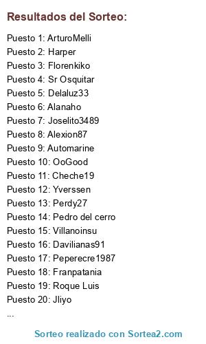 Lista de participantes: Marlito12, Competitivo2020, Scan1510, Simarro13, Florenkiko, Lmgr1989, Jliyo, Cheche19, Topo1610, Roque Luis, Harper, Franpatania, Fer_Don3p, Delaluz33, Kvothe the Hero, Peperecre1987, Cadista a muerte, OoGood, Pedro del cerro, Automarine, Villanoinsu, Davilianas91, Yverssen, Joselito3489, Saminhomerengue, Alanaho, Mr_Igorcete, Sr Osquitar, Perdy27, Alexion87, ArturoMelli.