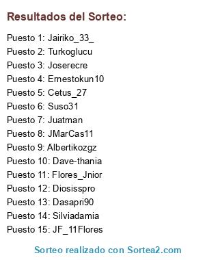Lista de participantes: Cetus_27, Flores_Jnior, Silviadamia, Turkoglucu, Dave-thania, Diosisspro, Joserecre, JF_11Flores, Jairiko_33_, Suso31, Juatman, Dasapri90, JMarCas11, Albertikozgz, Ernestokun10.