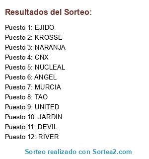 Lista de participantes: ANGEL, DEVIL, JARDIN, NARANJA, KROSSE, NUCLEAL, EJIDO, TAO, RIVER, MURCIA, UNITED, CNX.