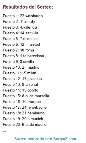 Lista de participantes: 1.fc barcelona ,, 10.liverpool, 11.m.city, 12.m united, 13.tothenham, 14.ast villa, 15.milan, 16.inter, 17.juventus, 18.roma, 19.oporto, 2.r madrid, 20.b munich, 21.hamburgo, 22.wolsburgo, 23.schalke, 24.fenerbache, 3.sevilla, 4.valencia, 5.villareal, 6.at de madrid, 7.ol de lion, 8.ol de marsella, 9.arsenal.