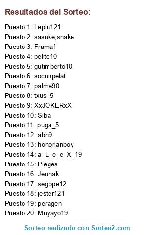 Lista de participantes: Erbez08, Mediociego_, Sanchezcrack, sl4M, se_wiwi, DiviciacoS, Danikungala, Javinho, Jordanpll, Pety_xerez, Yagomadmax, Marckill, Chancho_666, kink23, jaras, Tevillo, Fjmesa, Namisolis, Patanrra, Pedrinho.