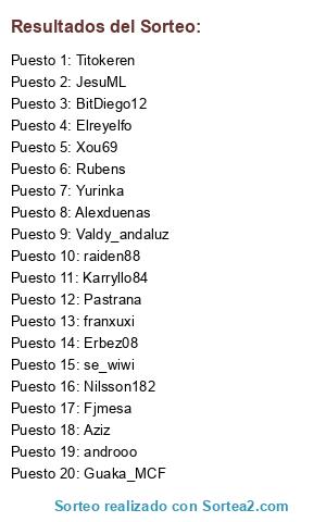 Lista de participantes: Erbez08, Elreyelfo, Fjmesa, Xou69, Pastrana, JesuML, Aziz, Titokeren, Alexduenas, androoo, Yurinka, raiden88, BitDiego12, se_wiwi, franxuxi, Valdy_andaluz, Guaka_MCF, Karryllo84, Rubens, Nilsson182.