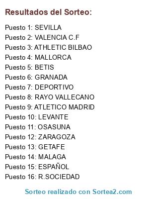 Lista de participantes: R.SOCIEDAD, GRANADA, MALLORCA, ZARAGOZA, ESPAÑOL, OSASUNA, RAYO VALLECANO, GETAFE, DEPORTIVO, ATHLETIC BILBAO, ATLETICO MADRID, BETIS, SEVILLA, LEVANTE, VALENCIA C.F, MALAGA.