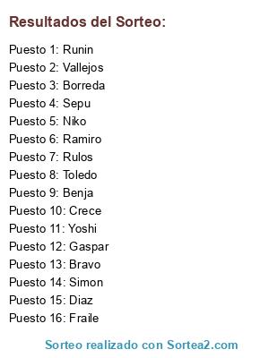 Lista de participantes: Gaspar, Diaz, Runin, Borreda, Niko, Simon, Crece, Ramiro, Bravo, Fraile, Benja, Toledo, Rulos, Sepu, Vallejos, Yoshi.