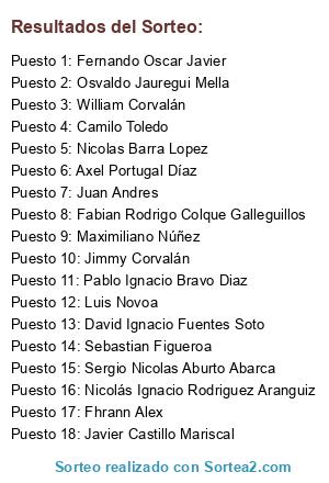 Lista de participantes: Fhrann Alex, William Corvalán, Javier Castillo Mariscal, Axel Portugal Díaz, Nicolás Ignacio Rodriguez Aranguiz, Fabian Rodrigo Colque Galleguillos, Fernando Oscar Javier, Luis Novoa, Juan Andres, Sebastian Figueroa, Osvaldo Jauregui Mella, David Ignacio Fuentes Soto, Nicolas Barra Lopez, Jimmy Corvalán, Camilo Toledo, Maximiliano Núñez, Pablo Ignacio Bravo Diaz, Sergio Nicolas Aburto Abarca.