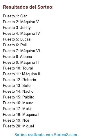 Lista de participantes: Albano, Maki, Miguel, Pablito, Poli, Noel, Qar, Nacho, Mauro, Jonhy, Lucas, Roberto, Soto, Toural, Chati, Patrick, Máquina I, Máquina II, Máquina III, Máquina IV.