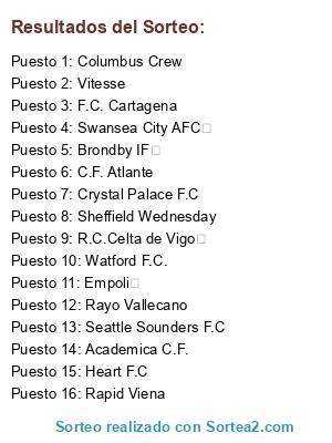 Lista de participantes: Academica C.F., Seattle Sounders F.C, Sheffield Wednesday, Vitesse, Swansea City AFC , Watford F.C., Crystal Palace F.C, Heart F.C, Brondby IF , C.F. Atlante, Columbus Crew, Empoli , F.C. Cartagena, R.C.Celta de Vigo , Rapid Viena, Rayo Vallecano.