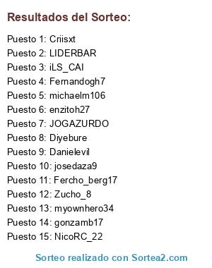Lista de participantes: enzitoh27, Fernandogh7, myownhero34, Fercho_berg17, iLS_CAI, josedaza9, JOGAZURDO, gonzamb17, Zucho_8, LIDERBAR, NicoRC_22, michaelm106, Diyebure, Criisxt, Danielevil.