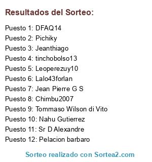 Lista de participantes: Tommaso Wilson di Vito, Nahu Gutierrez, Jeanthiago, Pichiky, Jean Pierre G S, Lalo43forlan, Sr D Alexandre, Chimbu2007, DFAQ14, Pelacion barbaro, Leoperezuy10, tinchobolso13.