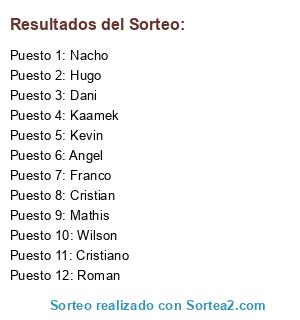 Lista de participantes: Angel, Dani, Kaamek, Hugo, Wilson, Roman, Cristiano, Nacho, Franco, Kevin, Mathis, Cristian.