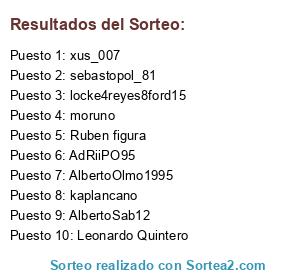 Lista de participantes: locke4reyes8ford15, AlbertoOlmo1995, kaplancano, AlbertoSab12, sebastopol_81, AdRiiPO95, Ruben figura, Leonardo Quintero, xus_007, moruno.