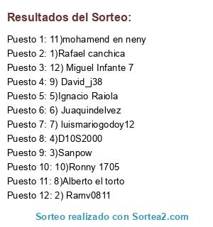Lista de participantes: 1)Rafael canchica, 2) Ramv0811, 3)Sanpow, 4)D10S2000, 5)Ignacio Raiola, 6) Juaquindelvez, 7) luismariogodoy12, 8)Alberto el torto, 9) David_j38, 10)Ronny 1705, 11)mohamend en neny, 12) Miguel Infante 7.