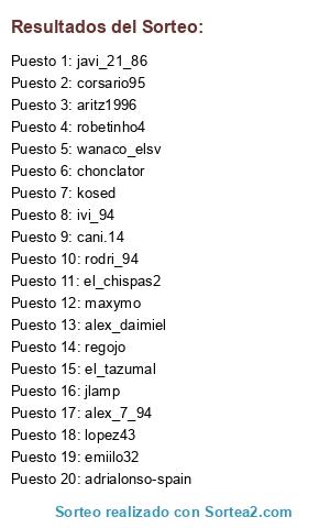Lista de participantes: emiilo32, rodri_94, ivi_94, maxymo, adrialonso-spain, corsario95, lopez43, robetinho4, alex_7_94, el_tazumal, kosed, el_chispas2, chonclator, jlamp, alex_daimiel, cani.14, regojo, wanaco_elsv, aritz1996, javi_21_86.
