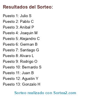 Lista de participantes: Rodrigo O, Juan B, Alejandro C, Pablo C, Julio S, Santiago G, Agustin Y, Bernardo S, Anibal P, German B, Gonzalo H, Joaquin M, Alvaro L.