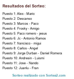 Lista de participantes: Andresin - Luismi, Juanlu - Fran, Alex - Mario, Carlos - Angel, Frosky - Amigo, Marcos - Paco, Jc - Antonio Ramos, Paco romero - jesus, Jose - Nando, Jorge Durban - Daniel Romera, francisco - migui, Descanso.