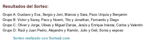 Lista de participantes: Raúl y Juan Pedro, Victor y Saray, Oliver y Jorge, Fernando y Diego, Gustavo y Eva, Jesús y Enrique Iniesta, Sonia y esposo, Paco y Noemi, Julio y Geli, Tito y Jonathan, Paco Urquía y Benjamin, Carlos y Valentin, Sergio y Joni, Marcos y Sara, Alejandro y Ramón, Ulises y Miguel Darias.