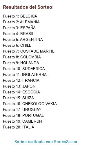 Lista de participantes: BELGICA, ESPAÑA, FRANCIA, COLOMBIA, BRASIL, HOLANDA, COSTADE MARFIL, CAMERUN, JAPON, URUGUAY, ALEMANIA, RUSIA, ITALIA, PORTUGAL, ARGENTINA, CHILE, SUIZA, SUECIA, INGLATERRA, CHEKOLOO VAKIA, MEXICO, SUDAFRICA, ESCOCIA.