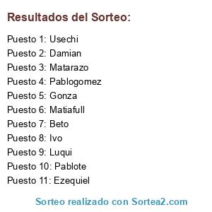 Lista de participantes: Usechi, Pablote, Matiafull, Beto, Ezequiel, Luqui, Matarazo, Damian, Ivo, Pablogomez, Gonza.