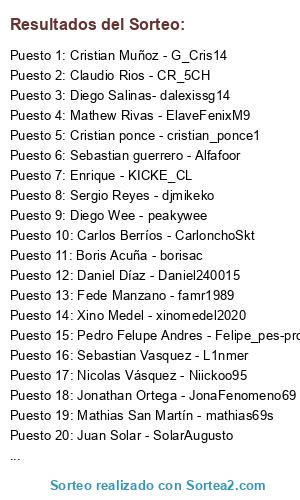 Lista de participantes: Cristian Muñoz - G_Cris14, Juan Solar - SolarAugusto, Nicolás Vargas - nicolas_snake_2, Mathew Rivas - ElaveFenixM9, Daniel Díaz - Daniel240015, Sergio Reyes - djmikeko, Cristian ponce - cristian_ponce1, Jonathan Ortega - JonaFenomeno69, Enrique - KICKE_CL, Diego Wee - peakywee, Fede Manzano - famr1989, Xino Medel - xinomedel2020, Mathias San Martín - mathias69s, Diego Salinas- dalexissg14, Gabriel Labra - Lbk-23, Luis Guerra - lfcoguerrac, Pedro Felupe Andres - Felipe_pes-pro, Sebastian Vasquez - L1nmer, Sebastian guerrero - Alfafoor, Claudio Rios - CR_5CH, Nicolas Vásquez - Niickoo95, Carlos Berríos - CarlonchoSkt, Boris Acuña - borisac.