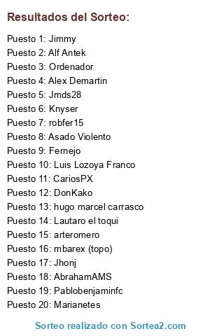 Lista de participantes: Marianetes, AbrahamAMS, Jhonj, Luis Lozoya Franco, Jimmy, Alf Antek, CariosPX, DonKako, Jmds28, Asado Violento, hugo marcel carrasco, arteromero, robfer15, mbarex (topo), Alex Demartin, Pablobenjaminfc, Fernejo, Lautaro el toqui, Ordenador, Knyser.