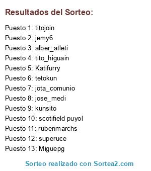 Lista de participantes: tito_higuain, alber_atleti, tetokun, jemy6, kunsito, jota_comunio, superuce, rubenmarchs, jose_medi, Katifurry, Miguepg, scotifield puyol, titojoin.