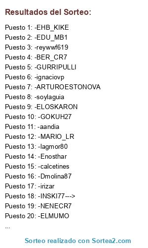 Lista de participantes: -ELMUMO, -ARTUROESTONOVA, -GURRIPULLI, -Enosthar, -ignaciovp, -linares35, -lagmor80, -NENECR7, -MARIO_LR, -BER_CR7, -GOKUH27, -EHB_KIKE, -calcetines, -irizar, -soylaguia, -ELOSKARON, -aandia, -Roberto_69_89, -reywwf619, -Dmolina87, -INSKI77--->, -EDU_MB1.