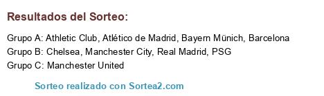 Lista de participantes: Atlético de Madrid, Real Madrid, Manchester United, Manchester City, Chelsea, Barcelona, PSG, Bayern Münich, Athletic Club.