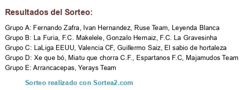 Lista de participantes: Arrancacepas, LaLiga EEUU, Valencia CF, Ruse Team, El sabio de hortaleza, Espartanos F.C, Guillermo Saiz, Fernando Zafra, F.C. La Gravesinha, F.C. Makelele, Ivan Hernandez, La Furia, Miatu que chorra C.F., Xe que bó, Majamudos Team, Leyenda Blanca, Yerays Team, Gonzalo Hernaiz.