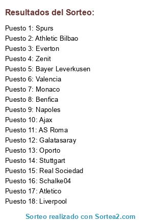 Lista de participantes: AS Roma, Napoles, Liverpool, Spurs, Everton, Atletico, Valencia, Real Sociedad, Athletic Bilbao, Monaco, Schalke04, Bayer Leverkusen, Stuttgart, Benfica, Oporto, Ajax, Galatasaray, Zenit.