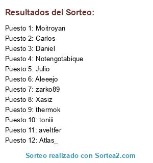 Lista de participantes: toniii, Atlas_, thermok, Carlos, Moitroyan, aveltfer, Notengotabique, Xasiz, Aleeejo, zarko89, Julio, Daniel.