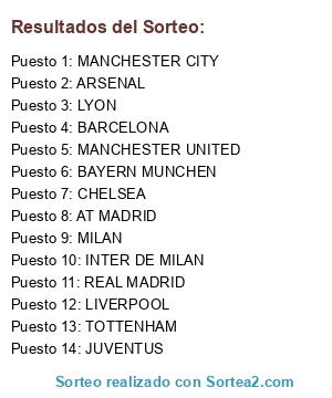 Lista de participantes: JUVENTUS, INTER DE MILAN, MILAN, LYON, BAYERN MUNCHEN, ARSENAL, CHELSEA, LIVERPOOL, MANCHESTER UNITED, MANCHESTER CITY, TOTTENHAM, BARCELONA, REAL MADRID, AT MADRID.