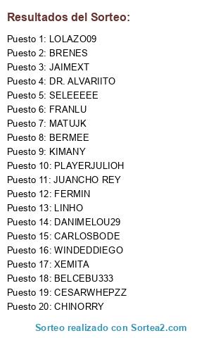 Lista de participantes: FRANLU, CARLOSBODE, LINHO, FERMIN, SENZU, BERMEEE, JULIOH, LIBANO ROJO, JAIME, MATUJK, SELEEEEE, KIMANY, BRENES, PAKIU, XEMITA, SINPLOMO.