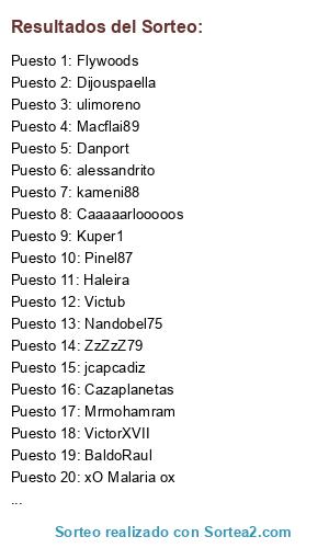 Lista de participantes: alessandrito, Caaaaarlooooos, Kuper1, jcapcadiz, Cazaplanetas, Macflai89, Flywoods, BaldoRaul, xO Malaria ox, ulimoreno, Mrmohamram, Nandobel75, Suprunaman, Dijouspaella, ZzZzZ79, VictorXVII, Victub, Pinel87, DarkanESP, Haleira, kameni88, Danport, Nurhio.