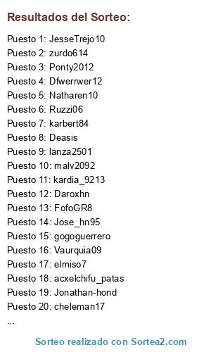 Lista de participantes: acxelchifu_patas, J_Masca17, hatakeczarito, balin2525, lanza2501, jasonop7, Carash082016, Dfwerrwer12, cheleman17, Jonathan-hond, csalinashn, Elmandeayer, Oseguera29, Luizava, brayan_10real, Miguelbass1, elmiso7, Ruzzi06, zurdo614, pollogool-, gejacodi97, KingAdrian956, fadar9709, Mutu504, Daroxhn, Ponty2012, gogoguerrero, medar_r16, adrian_united, Jose_hn95, malv2092, FofoGR8, JesseTrejo10, Natharen10, Elbison25, Prodigioc, Emohall23, davidlpz10_hn, Alvaradohn, smith123456578, jossep7, msosaf0406, Saint_muma24, FIWC_MikeyG, karbert84, lamachigue11, Muma10_elflak0o, ixx-josee504-xxi, mauriciovargas7, kardia_9213, Deasis, RafaelV2525, EdRey9090, fda_14, Roger_pascua, leo_pineda, Vaurquia09, MvP_Coroso-Co-, Soto04-27-1993, ElMeroFernando14.