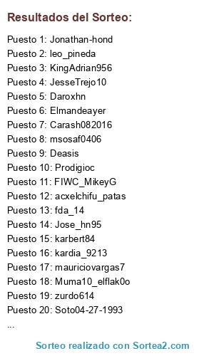 Lista de participantes: acxelchifu_patas, J_Masca17, hatakeczarito, balin2525, lanza2501, jasonop7, Carash082016, Dfwerrwer12, cheleman17, Jonathan-hond, csalinashn, Elmandeayer, Oseguera29, Luizava, brayan_10real, Miguelbass1, elmiso7, Ruzzi06, zurdo614, pollogool-, gejacodi97, KingAdrian956, fadar9709, Mutu504, Daroxhn, Ponty2012, gogoguerrero, medar_r16, adrian_united, Jose_hn95, malv2092, FofoGR8, JesseTrejo10, Natharen10, Elbison25, Prodigioc, Emohall23, davidlpz10_hn, Alvaradohn, smith123456578, jossep7, msosaf0406, Saint_muma24, FIWC_MikeyG, karbert84, lamachigue11, Muma10_elflak0o, ixx-josee504-xxi, mauriciovargas7, kardia_9213, Deasis, RafaelV2525, EdRey9090, fda_14, Roger_pascua, leo_pineda, Vaurquia09, MvP_Coroso-Co-, Soto04-27-1993, ElMeroFernando14.