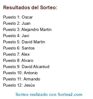 Lista de participantes: Juan, David Alcantud, Javi, Alex, David Martin, Alejandro Martin, Alvaro, Armando, Jesús, Oscar, Antonio, Santos.