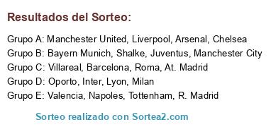 Lista de participantes: R. Madrid, Barcelona, At. Madrid, Valencia, Villareal, Chelsea, Manchester United, Manchester City, Tottenham, Arsenal, Liverpool, Milan, Roma, Inter, Juventus, Napoles, Shalke, Bayern Munich, Oporto, Lyon.