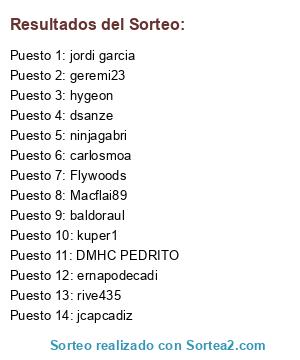 Lista de participantes: jcapcadiz, Flywoods, baldoraul, kuper1, hygeon, ernapodecadi, geremi23, ninjagabri, carlosmoa, Macflai89, dsanze, DMHC PEDRITO, jordi garcia, rive435.